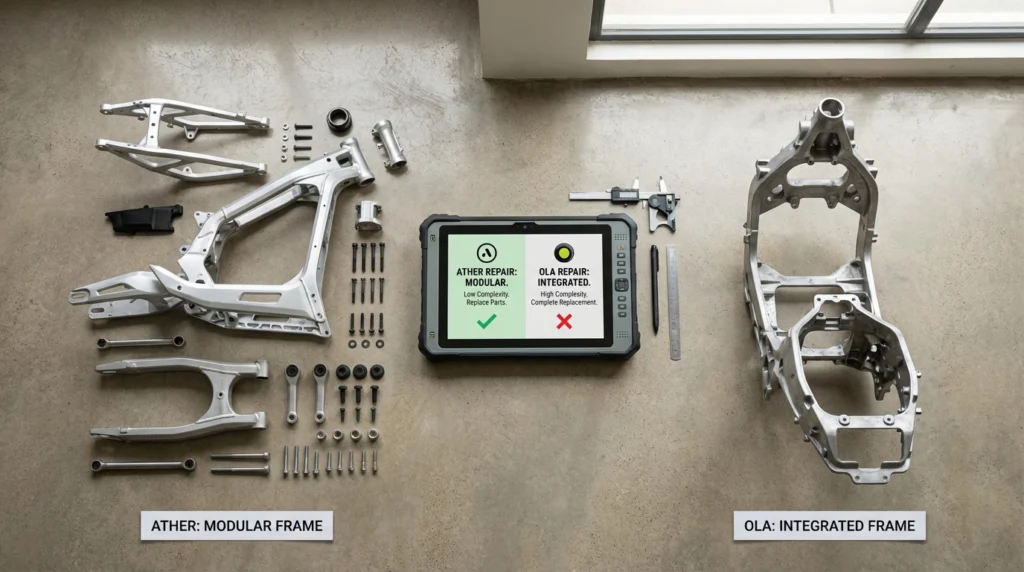 - The Repairability Gap: Ather’s modular design leads to cheaper minor claims, while Ola’s integrated chassis often results in higher ‘Total Loss’ declarations by surveyors.