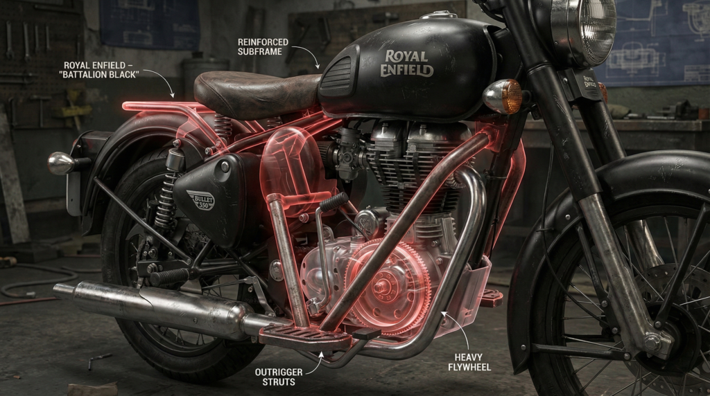 - The Inertia Advantage: Standard high-performance bikes (KTM/Himalayan 450) use light flywheels for quick acceleration. The Daredevil Bullets use high-mass flywheels that prevent stalling at the 7–12 km/h “Parade Crawl.”
